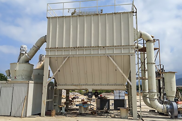 大塊物料經破碎機破碎到所需粒度(30mm)后,由提升機將物料送至儲料斗,再由皮帶機將物料均勻定量連續(xù)地送入主機磨室磨粉機內進行研磨。粉磨后的物料被風機氣流送入選粉機進行分級。在選粉機葉輪的作用下,不符合細度要求的物料落入磨室內重新碾磨;合格的物料則經空氣斜槽進入旋風集粉器內,進行分離收集,經排料裝置排出即為成品粉體。整個過程屬于閉路循環(huán)系統(tǒng),并在正負壓狀態(tài)下運行,配備以脈沖除塵器,保證了生產現(xiàn)場的干凈、整潔。