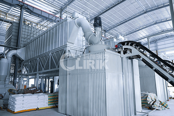 破碎后的小塊膨潤(rùn)土經(jīng)提升機(jī)送至料倉(cāng),再經(jīng)振動(dòng)給料機(jī)將其均勻定量的送入磨粉機(jī)研磨室內(nèi)進(jìn)行研磨。